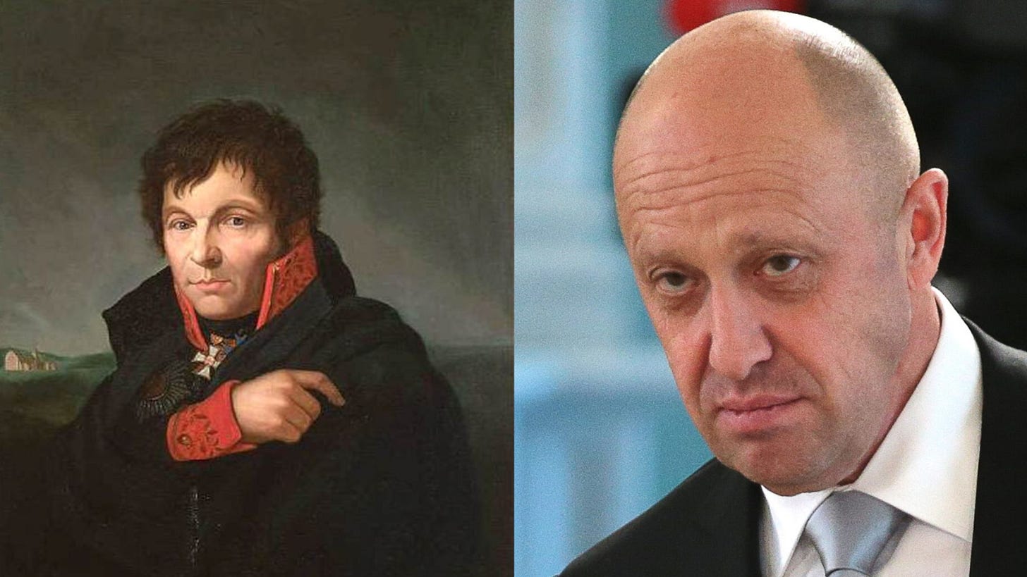 (Bildmontage: Fragen zur Zeit; Scharnhorst: Friedrich Bury, Public domain, via Wikimedia Commons; Prigoschin: Михаил Метцель / ТАСС, CC BY 4.0, via Wikimedia Commons)