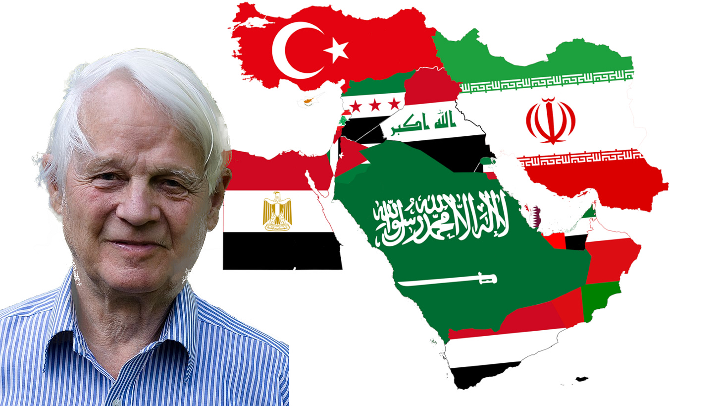 (Bildmontage: Fragen zur Zeit; Richard Lynn: Gothick, CC BY-SA 3.0, via Wikimedia Commons; Karte Mittlerer Osten: Frenchybal, CC BY 4.0, via Wikimedia Commons)