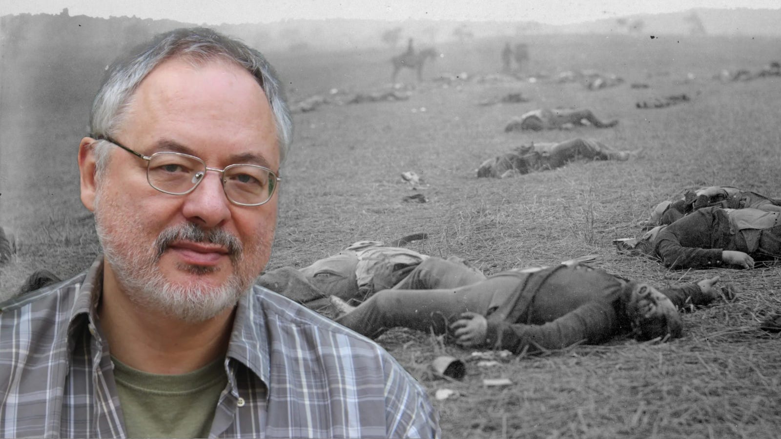 (Bildmontage: Fragen zur Zeit; Tote auf dem Schlachtfeld von Gettysburg: Timothy H. O’Sullivan, Public domain, via Wikimedia Commons; Peter Turchin: Peter Turchin, CC BY 4.0, via Wikimedia Commons)